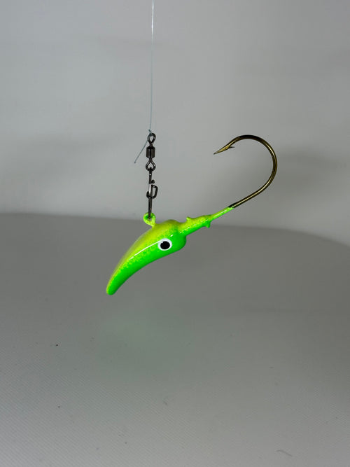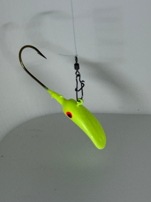 Introducing the world's first jig intentionally designed to drift. This design came from drifting on the Wolf River in Wisconsin where at times the fishing pressure can be absolutely insane. The shape of this jig allows the nose to dive and look like a minnow eating on the bottom while keeping the hook elevated and out of snags. These jigs simply catch fish when the pressure is high and the fish are tired of looking at the same old thing. Give it a try today and send in pics of your catch! Comes in a pack of 8.